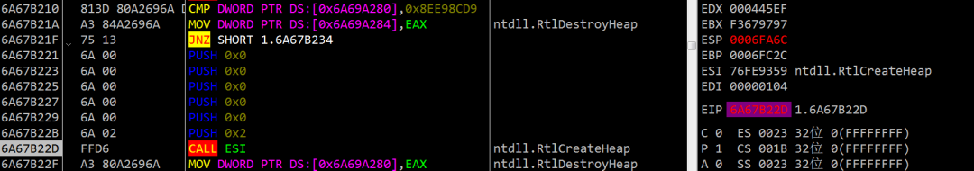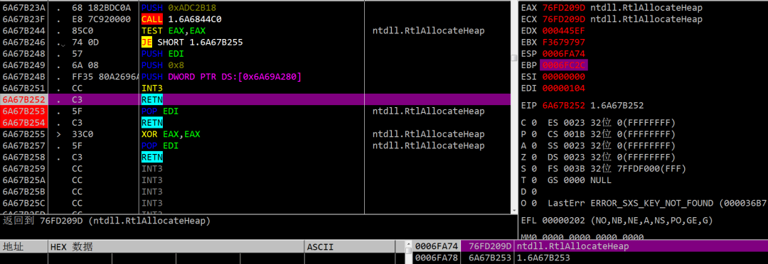 跳过异常之后通过retn执行RtlAllocateHeap函数。