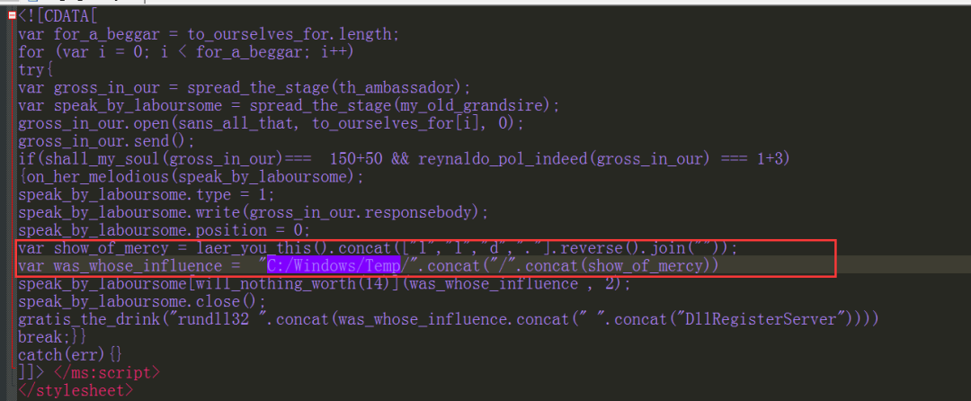 上面这个样本的服务器已经不能通信了,该病毒的最新变种前面的步骤和上面的都差不多,到这一步的xsl文件内容不同,最新的变种的xsl文件从服务器下载的是个dll文件。保存在C:/Windows/Temp文件下,名称是随机命名的。