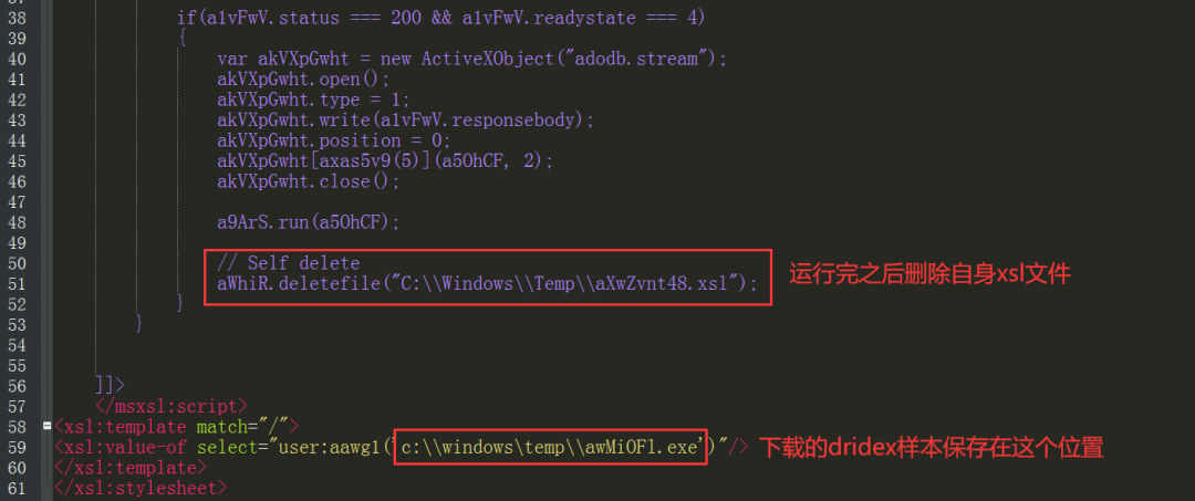 从服务器下载dridex木马并保存在temp目录,运行完之后删除自身xsl文件。