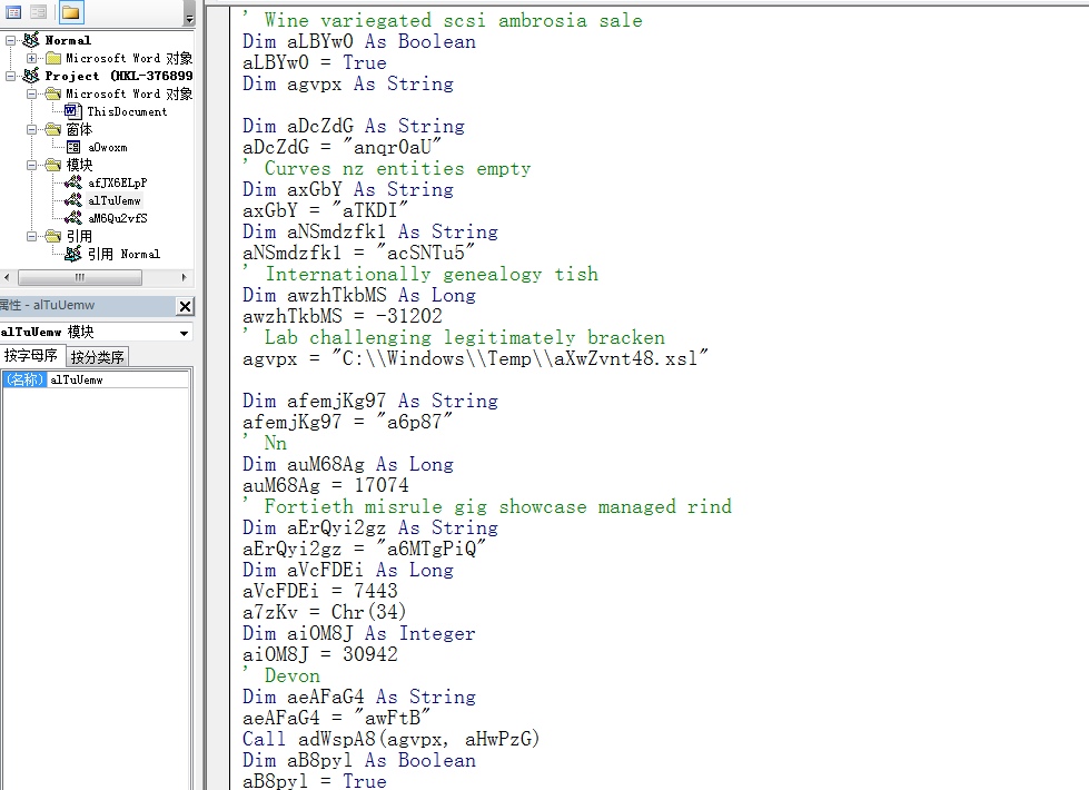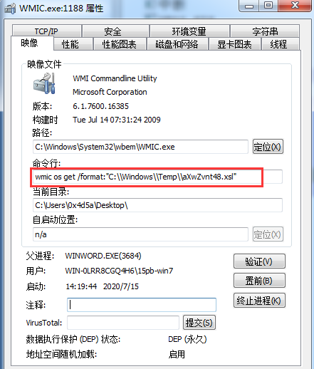 从宏代码中可以看到在C:\Windows\Temp释放了一个aXwZvnt48.xsl文件。并调用VMIC.exe执行释放的xsl文件。