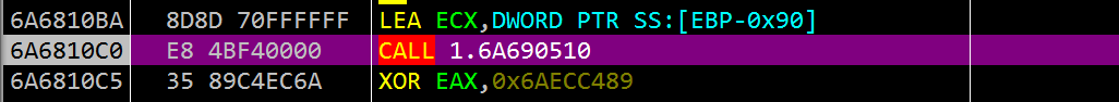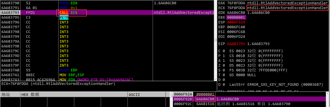获取到需要的函数之后,3790函数作用为执行获取到的函数。这里执行RtlAddVectoredExceptionHandler为注册VEH异常,其中6A686CB0为异常处理函数。
