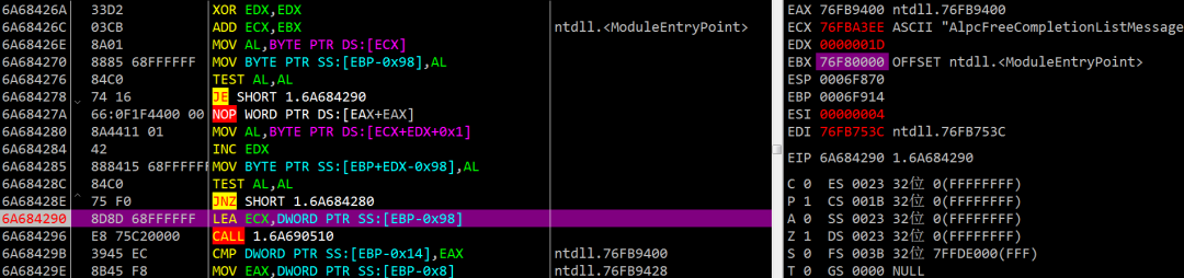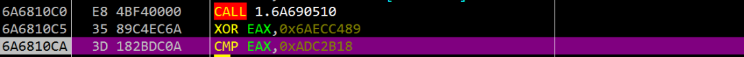 加密之后的字符串和0x6AECC489异或之后如果为0xADC2B18也就是ntdll.dll就通过自己实现的GetProcAddress函数获取指定函数的地址。