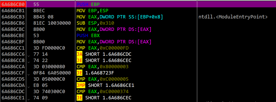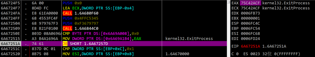 最终这里获取到ExitProcess函数的地址,然后退出了程序。不知道有什么地方的判断条件不满足,所以程序没有执行下去。