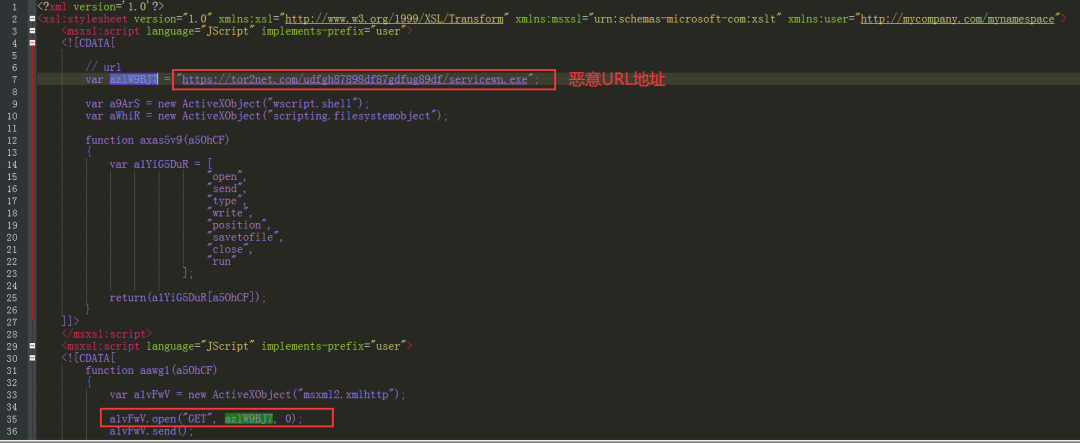 XSL文件内容如下,从tor2net.com下载恶意文件servicewn.exe。
