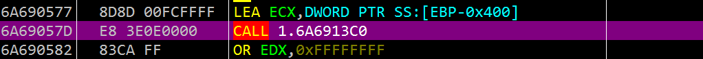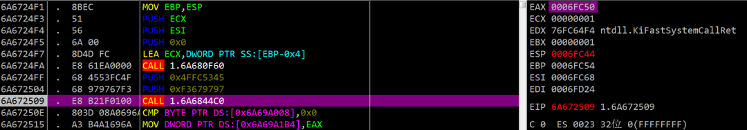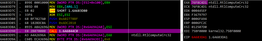 函数44C0为GetProcAddress,传递进去的两个参数一个是dll的加载基址,另一个是函数名。这里0xADC2B18是ntdll,0x92E0E512是RtlCreateHeap函数,0xD084EC36是RtlDestroyHeap函数。