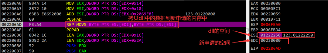 将上面处理的pe文件拷贝到刚才清空的空间当中。
