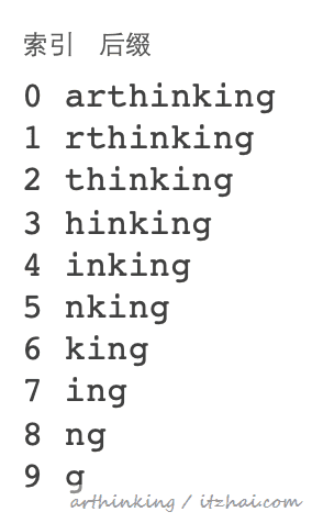 如下图,字符串:arthinking,所有的后缀,从长到短列出来: