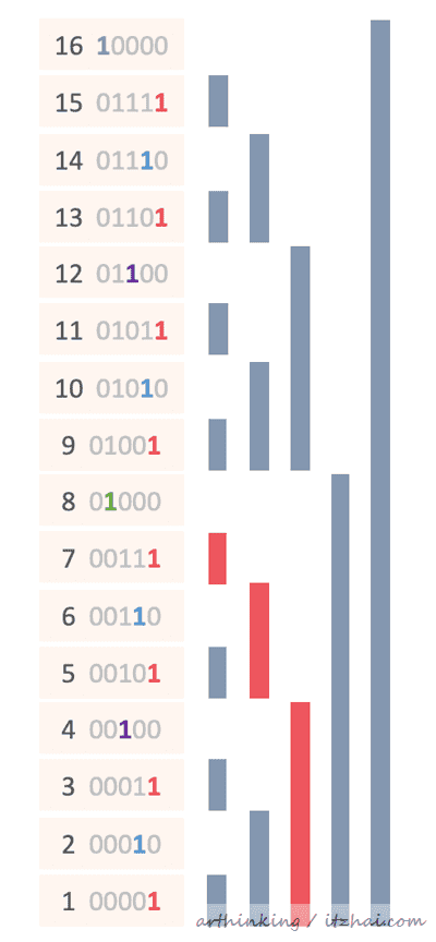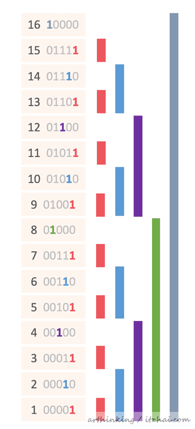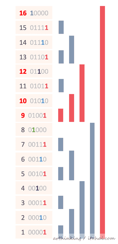 更新数组中的某一个元素的过程中,与范围查询相反,我们不断的根据LSB计算到下一个元素位置,同时给该元素更新数组。如下,更新A[9],会级联查找到以下红色的位置的元素: