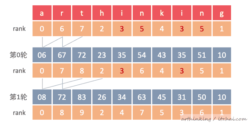 第1轮:suffix[i] = suffix[i] + suffix[2^1],重新评估rank;