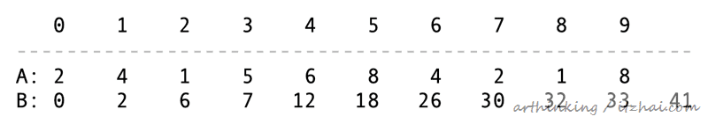 假设A为静态数组,B数组存放Fenwick Tree,我们首先把A数组clone到B数组,然后遍历A数组,每个元素A[i]依次加到下一个负责累加的B节点B[i + LSB]中(称为父节点),直到到达B数组的上界,代码如下: