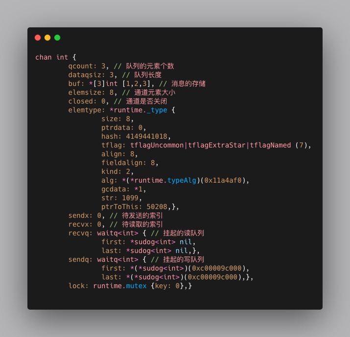 接下来我们分析一下 channel 在实际运行中,它的结构体是怎么样的。当然这又分为两种类型,有缓冲与无缓冲的。我们先来看一个无缓冲的情况。