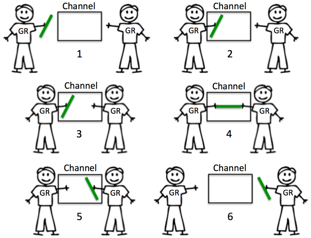 注意其中 buf 字段可存储的长度是0,这是因为 无缓冲 channel 不会用到循环队列来存储数据。它一定是等读、写 goroutine 都准备好了,然后直接把数据交给对方。我们用一副图来看一下无缓冲的数据交换过程。
