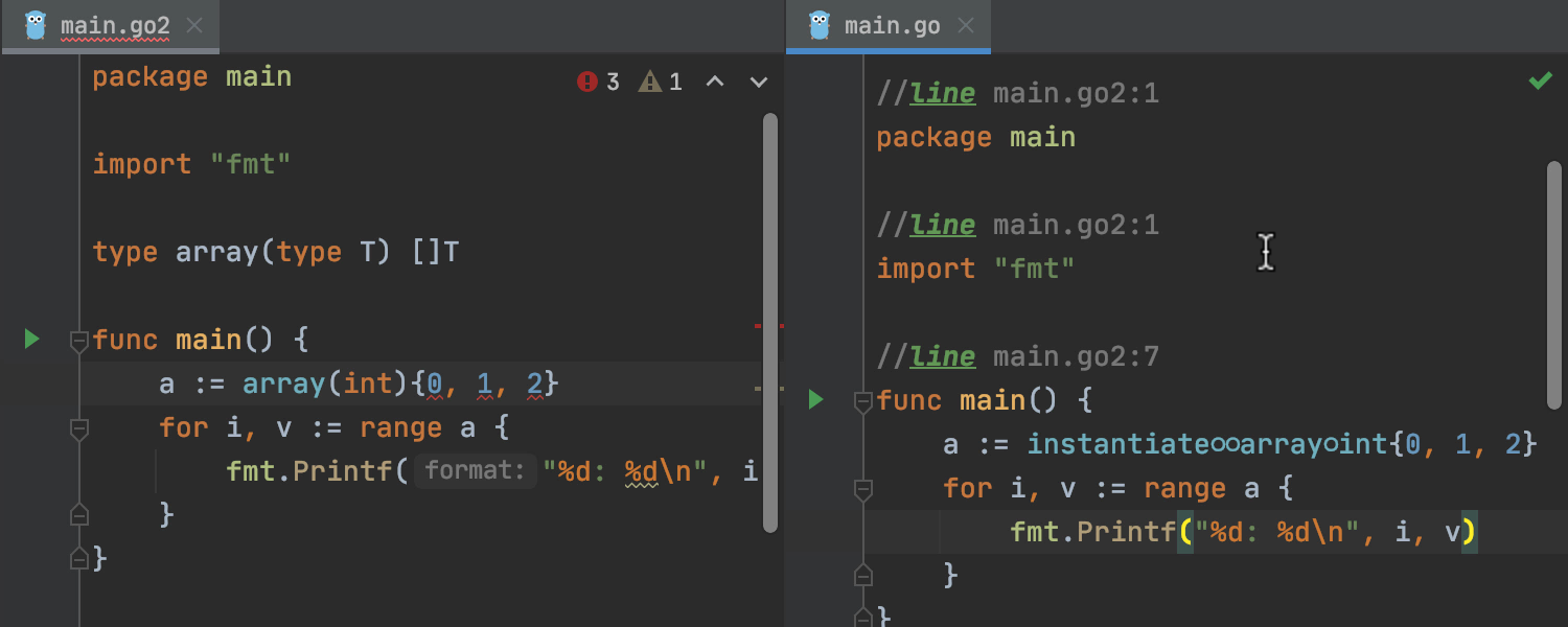 GoLand 2020.2 为泛型提供了实验性支持,可通过打开Enable experimental support for generics a.k.a. type parameters设置(位置是 Settings/Preferences | Go )来试用泛型。