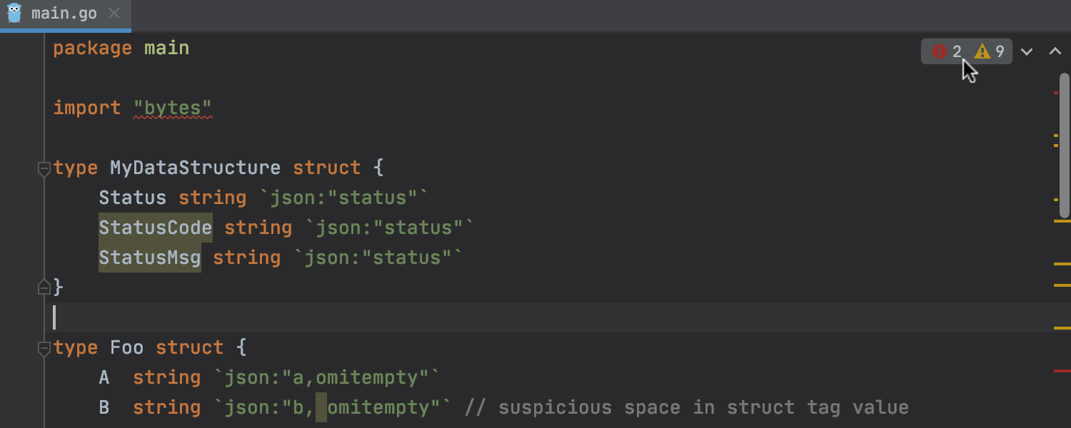 go vet - Malformed struct tag 代码检查会检查结构标记是否符合 Go 惯例并就潜在问题进行通知