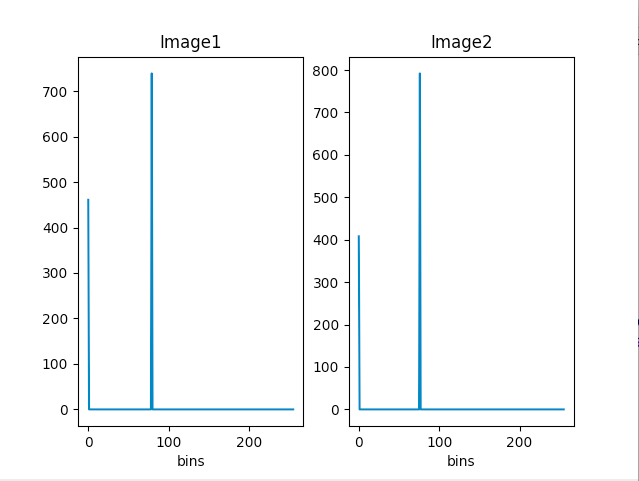hist=cv2.calcHist(gray_img,[0],None,[256],[0,256])hist1=cv2.calcHist(gray_img1,[0],None,[256],[0,256])plt.subplot(121)plt.title("Image1")plt.xlabel('bins')plt.ylabel("No of pixels")plt.plot(hist)plt.subplot(122)plt.title("Image2")plt.xlabel('bins')plt.ylabel("No of pixels")plt.plot(hist1)plt.show()