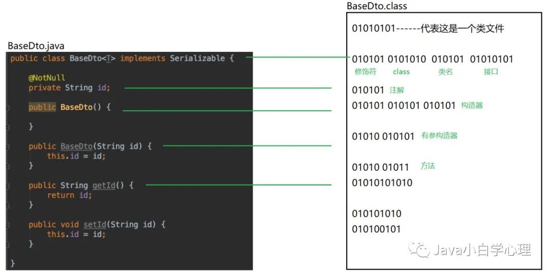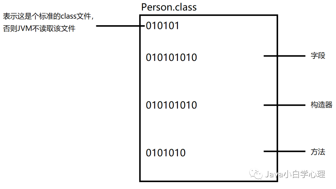 同样的,JVM对.class文件也有一套自己的读取规则,不需要我们操心。总之,0101代码在它眼里的样子,和我们眼中的英文源码是一样的。