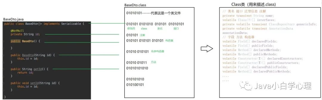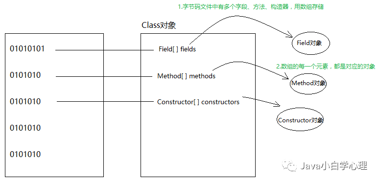 上面分析过,.class文件通过IO被加载到内存后,JDK创造了至少四个对象:Class、Field、Method、Constructor,这些对象其实都是0101010的抽象表示。