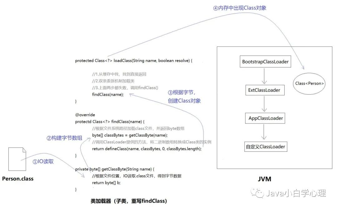 @Overridepublic Class<?> findClass(String name) throws ClassNotFoundException {try {/*自己另外写一个getClassData()通过IO流从指定位置读取xxx.class文件得到字节数组*/byte[] datas = getClassData(name);if(datas == null) {throw new ClassNotFoundException("类没有找到:" + name);}//调用类加载器本身的defineClass()方法,由字节码得到Class对象return defineClass(name, datas, 0, datas.length);} catch (IOException e) {e.printStackTrace();throw new ClassNotFoundException("类找不到:" + name);}}
