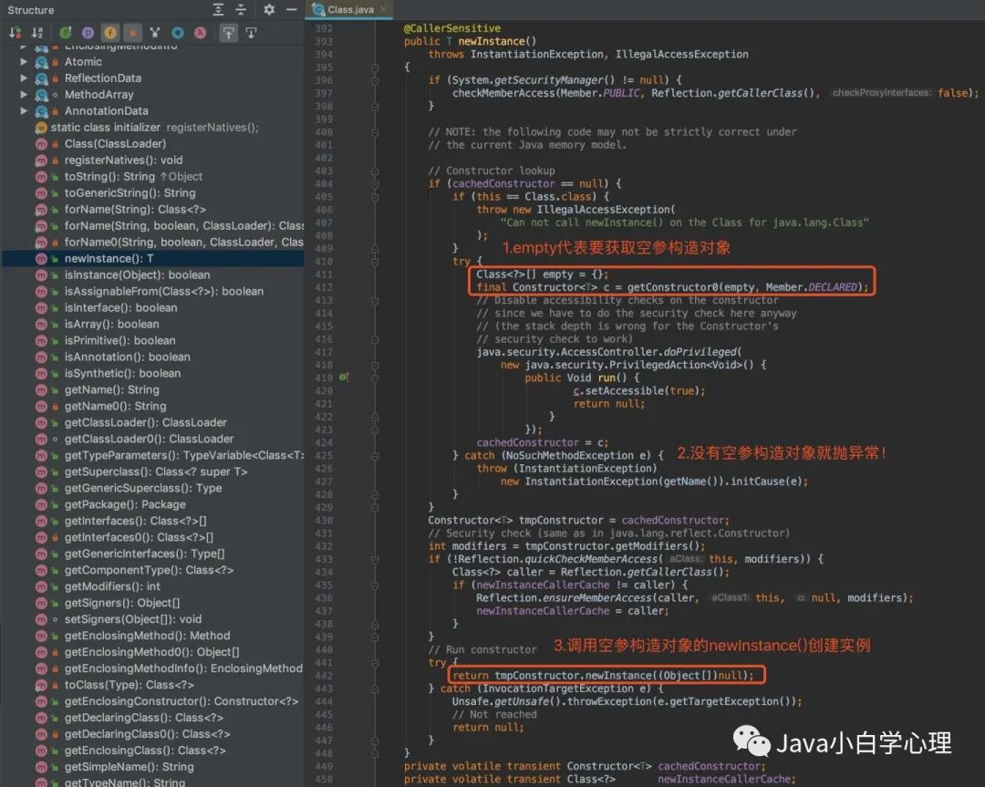 所以,本质上Class对象要想创建实例,其实都是通过构造器对象。如果没有空参构造对象,就无法使用clazz.newInstance(),必须要获取其他有参的构造对象然后调用构造对象的newInstance()。
