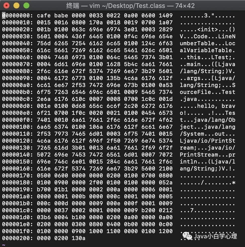 用vim命令打开.class文件,以16进制显示就是下面这副鬼样子: