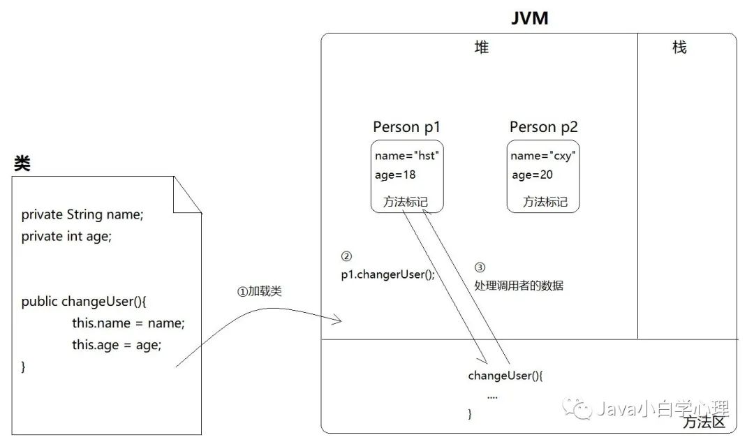 对象 p1保存了"hst"和18,p2保存了"cxy"和20。但是不管是p1还是p2,都会有changeUser(),但是每个对象里面写一份太浪费。既然是共性行为,可以抽取出来,放在方法区共用。