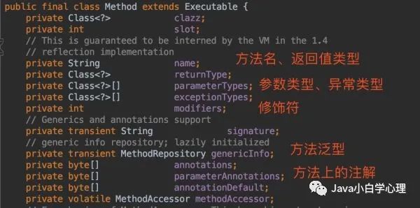 而且,针对字段、方法、构造器,因为信息量太大了,JDK还单独写了三个类,比如Method类: