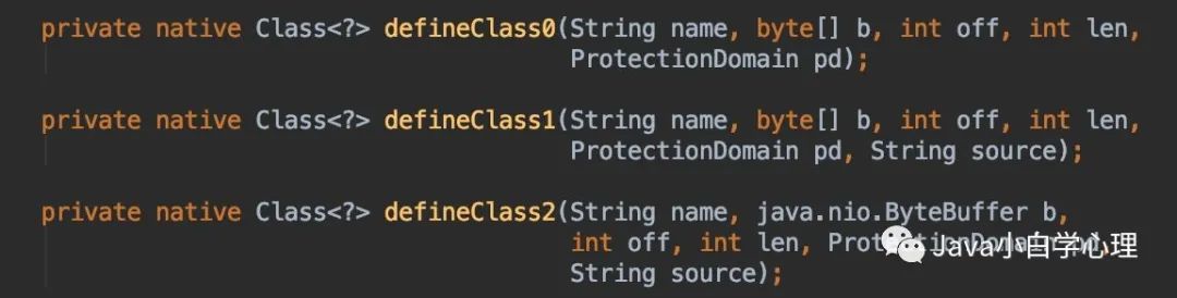 defineClass()是ClassLoader定义的方法,目的是根据.class文件的字节数组byte[] b造出一个对应的Class对象。我们无法得知具体是如何实现的,因为最终它会调用一个native方法: