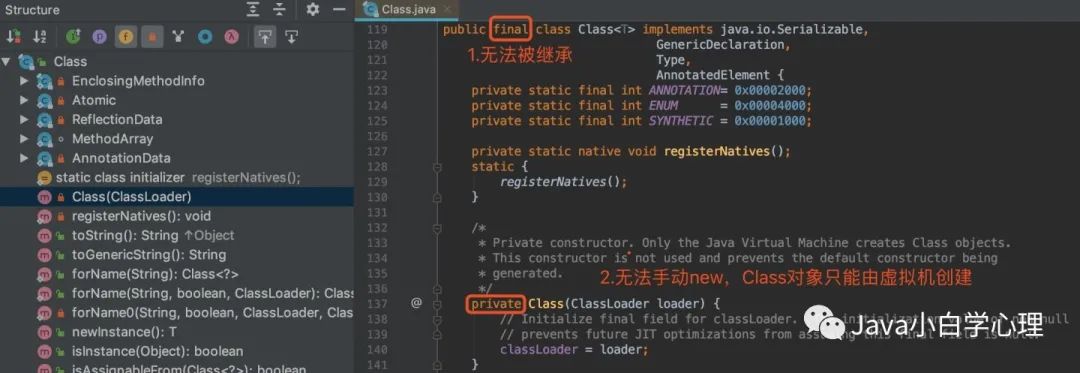 可以发现,Class类的构造器是私有的,我们无法手动new一个Class对象,只能由JVM创建。JVM在构造Class对象时,需要传入一个类加载器,然后才有我们上面分析的一连串加载、创建过程。