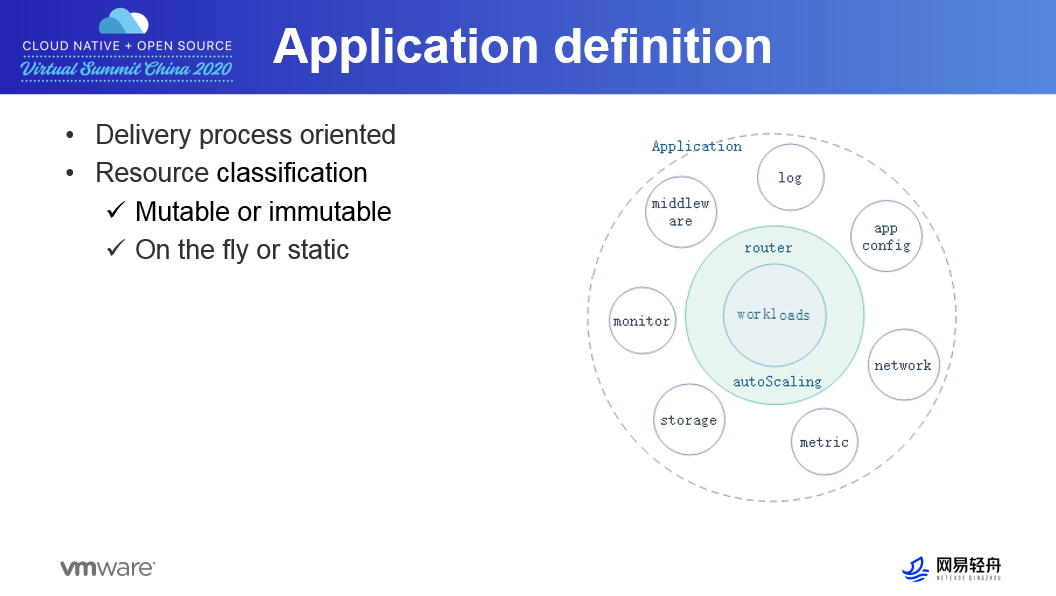如图,网易轻舟是基于交付过程定义应用资源的,Workload 是应用交付的核心,围绕这个核心是路由规则、自动扩缩容等在应用交付过程中易变的资源,也是次核心资源,外围则是一些静态资源,如日志配置、网络配置等,一次配置完成之后基本上不会再变更。这是一个面向应用交付过程的设计,把交付过程中需要频繁干预的一些资源归为一类,不需要频繁干预的资源归为一类,通过这样的归类可以较好的组织交付流程。