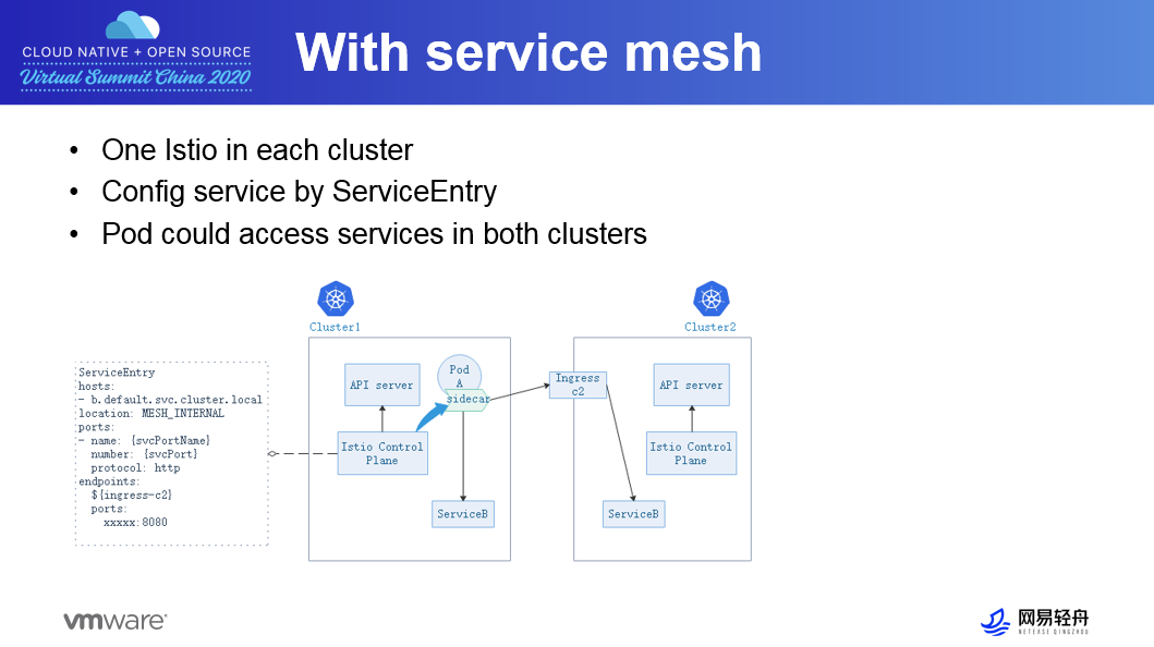 如图是应用交付和 Service Mesh 的一个集成。网易轻舟在两个集群里面部署了两套 Istio 控制面,并分别配置对应集群服务的相关信息,把这两个集群服务信息聚合起来,放到 sidecar 的里面,这样当业务需要访问这些服务时,不仅可以访问本集群的服务,还可以访问另一个集群里面的服务。