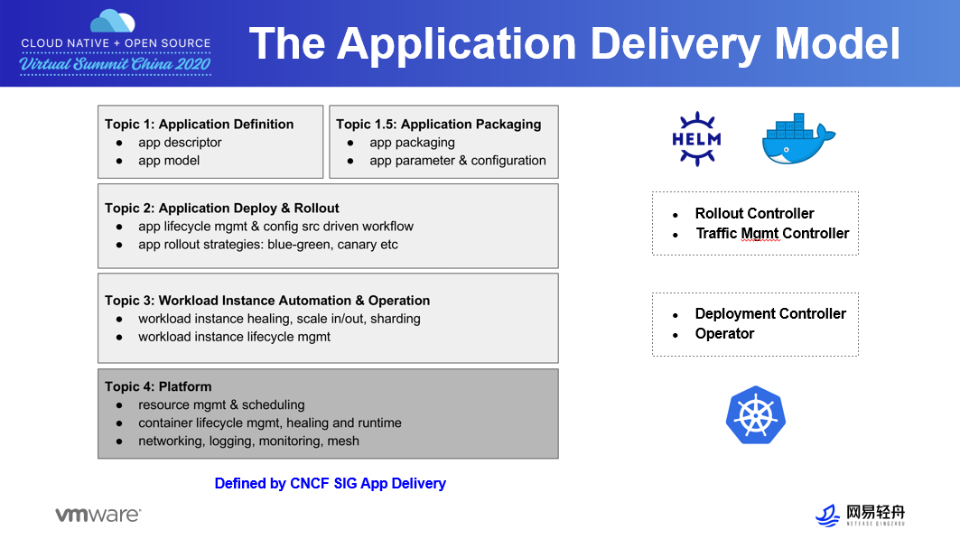 在日前的 KubeCon 2020 中国线上峰会上,VMware 中国研发中心架构师、Harbor 项目创始人和维护者张海宁,和网易数帆轻舟业务部架构师、Harbor 维护者裴明明,共同分享了如何在多云和多集群环境下高效率高质量地交付应用。张海宁介绍了应用交付的模型,面临的主要问题,以及如何使用云原生的方法实现应用的定义和交付。裴明明则通过网易轻舟云原生应用交付平台的设计与实践,分享了多云和跨集群环境下的应用交付的核心要素、应用场景与业务收益。