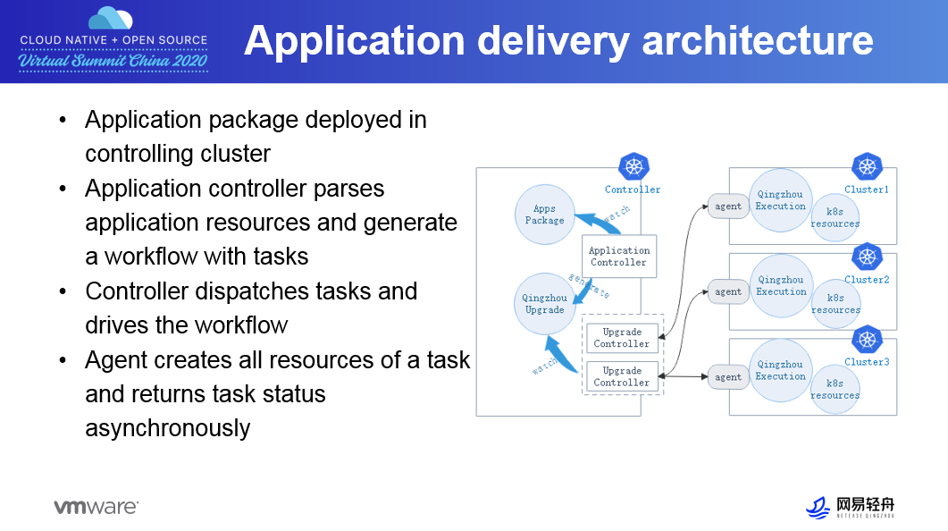 根据上述架构设计,网易轻舟把一个应用交付到多个集群中的具体实践,首先定义应用的 package,以及相关的 Environment,包括集群、namespace、权重、workload 的占比、部署到哪些集群等。当 Application Controller 监控到应用资源创建,它就会形成一个 flow,里面定义了在哪个集群上面需要做哪些事情,Upgrade Controller会将每个阶段定义的任务通过Agent下发到计算集群中。之后收到任务的 agent 会执行具体资源的部署,并把部署完成的结论反馈过去,然后由 Upgrade Controller 接着驱动后面的流程。这种实现的一个好处是用户实际上面对的是整个应用的视图,不需要关心应用的具体部署,对用户而言,应用和服务都是一个整体;另外一个好处,在运维的时候,运维工程师可以从应用的视角去管理不同集群上的资源,比较方便的看到这些资源的关联。