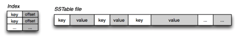 SSTable(Sorted String Table) :是一个键是有序的,存储字符串形式键值对的磁盘文件。当SSTable太大时,可以将其划分为多个block;我们需要通过 下图中的Index 记录下来每个block的起始位置,那么就可以构建每个SSTable的稀疏索引。这样在读SSTable前,通过Index结构就知道要读取的数据块磁盘位置了。