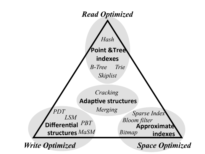 RUM(Read,Write,Memory)类似分布式领域的CAP定理。如果想得到三者中的两者性能,必须以牺牲第三者的性能为代价。衡量这三者的性能指标有:读放大、写放大、空间放大。