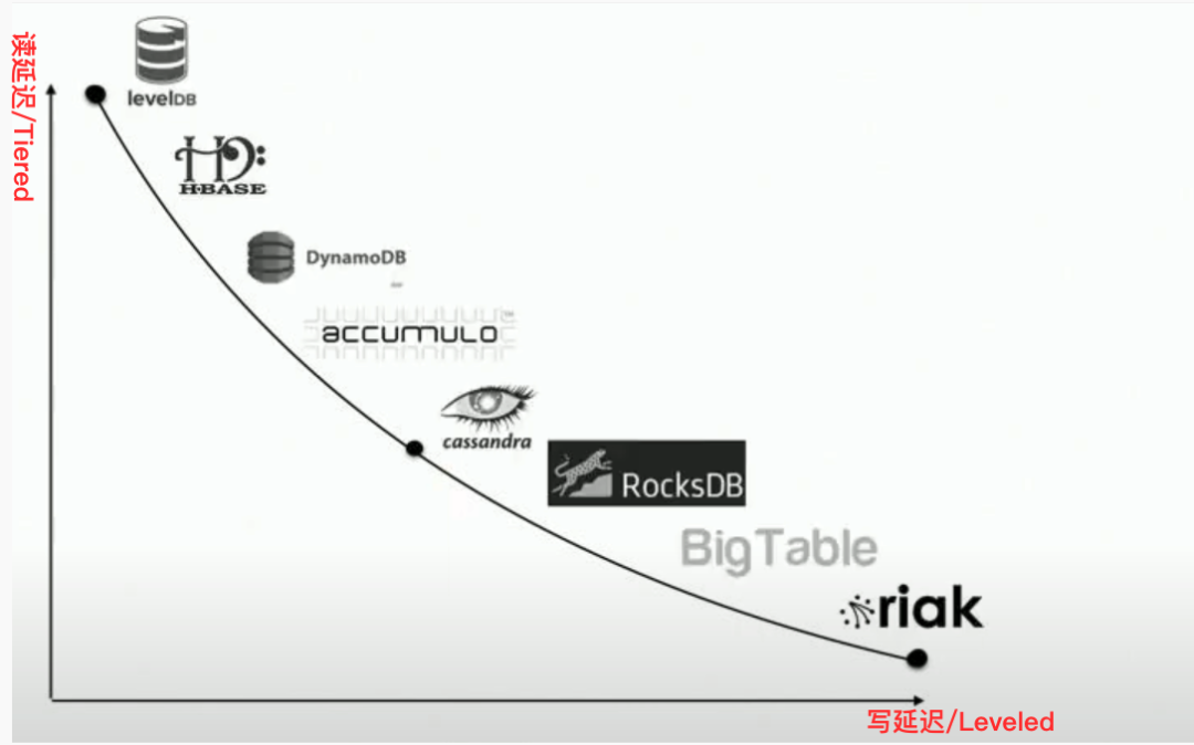 上面提到了两种合并策略Tiering 和 Leveling。Tiering可以减小写放大,Leveling可以减小读放大和空间放大。参考资料【3】中提到了数据库所采用的合并策略走势如下: