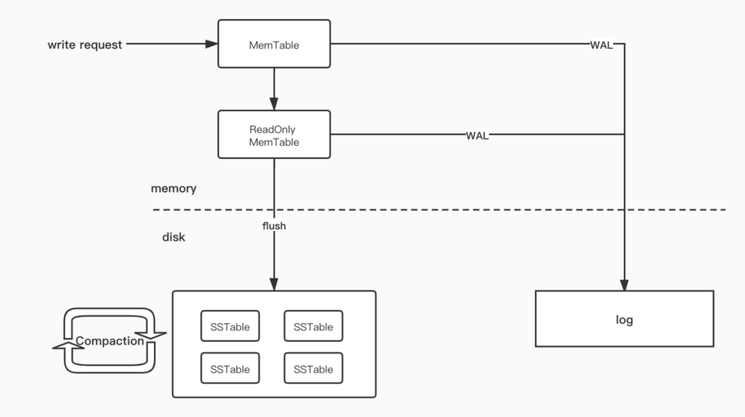 当有写请求时,数据会先写入MemTable,同时写入 WAL Log;当MemTable空间不足时,触发ReadOnly MemTable copy,同时写入WAL Log;然后刷新到磁盘Level0的SSTable中。当低层SSTable空间不足时,不断通过Compaction和高层SSTable进行Merge。