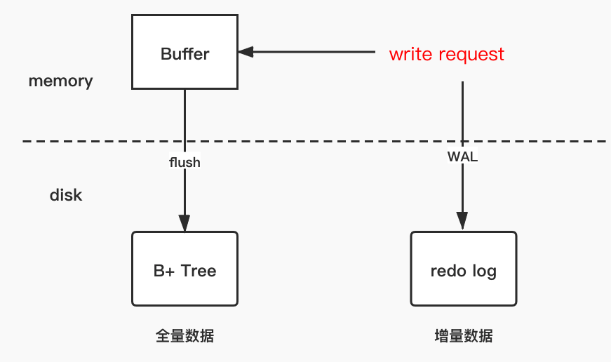 redo log是数据增删改的实时增量数据,顺序写入保证了写性能和事务性。磁盘上的B+树是数据增删改的全量数据,通过定时脏页刷盘保证这份数据的完整性。