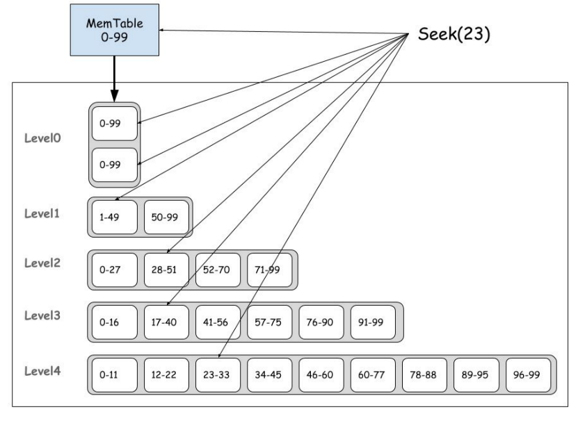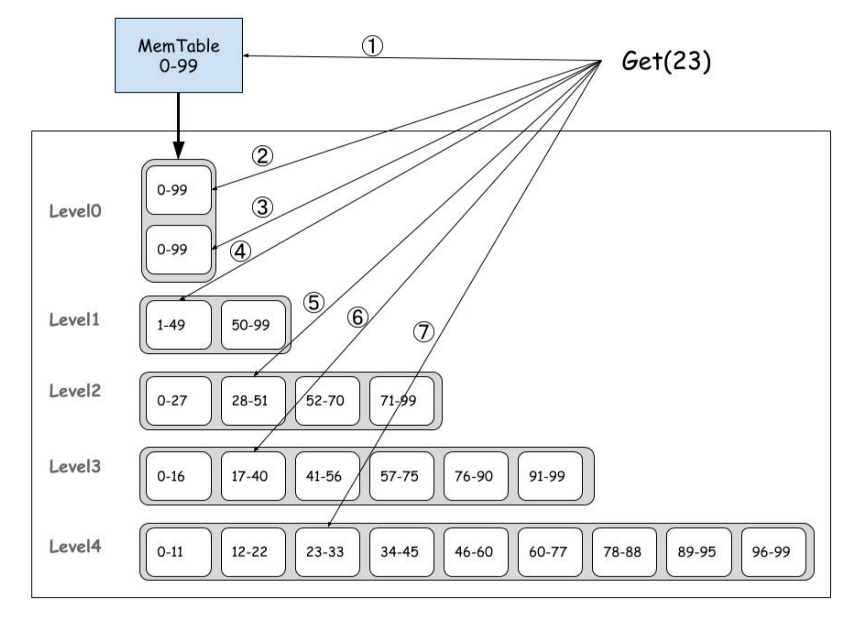 按照图中标示的顺序,会先读取内存,在从Level0依次往高层读取,直到找到key=23的数据。