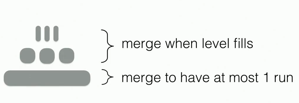Leveling 的特点是:每层只有一个sorted run,当上一层的sorted run 要merge下来时,会马上和当前层的sorted run合并。
