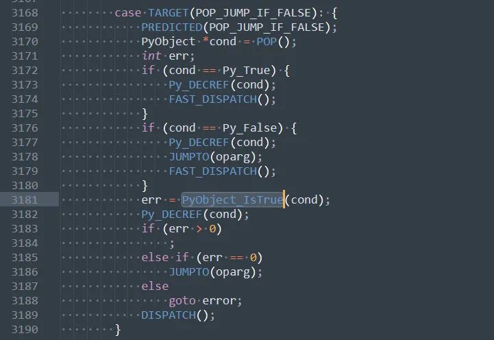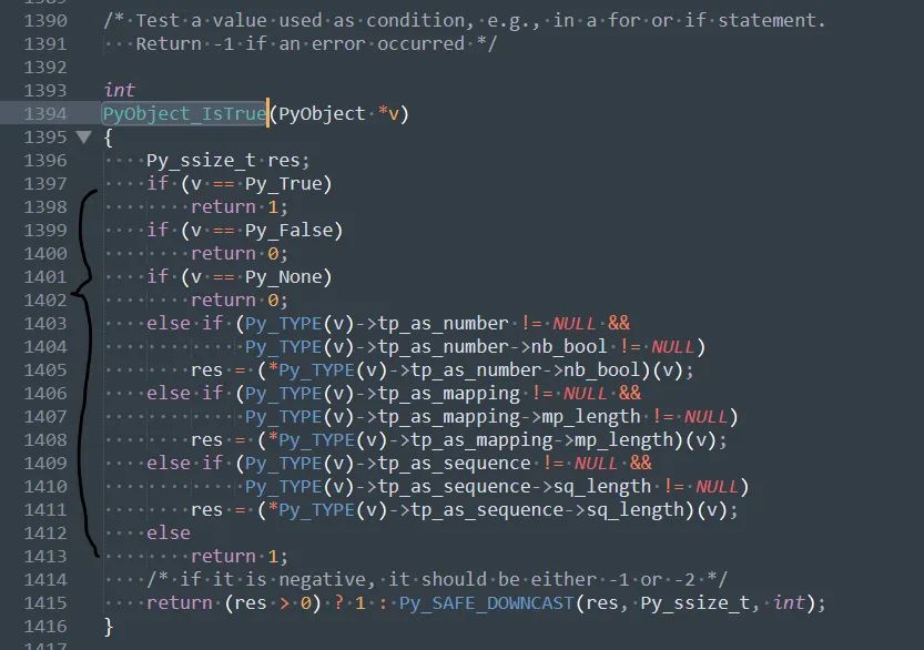 可以看出,对于布尔类型的对象(即 Py_True 和 Py_False),代码会进入到快速处理的分支;而对于其它对象,则会用 PyObject_IsTrue() 计算出一个 int 类型的值。