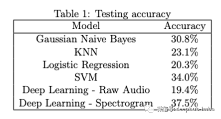 在谱图中应用迁移学习的卷积神经网络是性能最好的,尽管SVM和Gaussian naivebayes在性能上相似(考虑到后者的简化假设,这本身就很有趣)。我们在报告中描述了最好的超参数和模型体系结构。