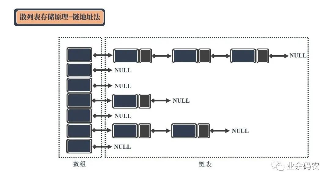 链地址法:链地址法其实就是对Key通过哈希之后落在同一个地址上的值,做一个链表。其实在很多高级语言的实现当中,也是使用这种方式处理冲突的。