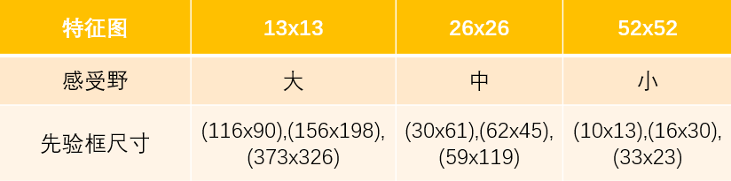 较大的52x52特征图上(较小的感受野)应用较小的先验框(10x13),(16x30),(33x23),适合检测较小的对象。如下表: