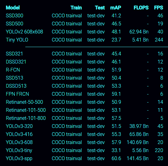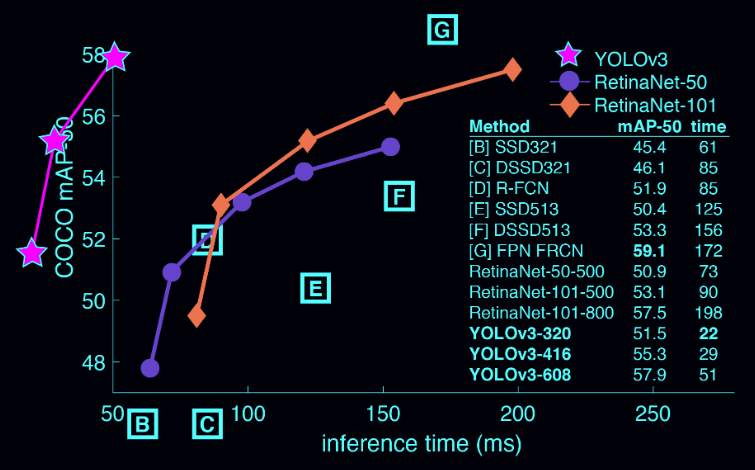 从下面各算法在COCO数据集上的性能图中,我们也可以清楚的看到YOLO-V3算法的强大性能。