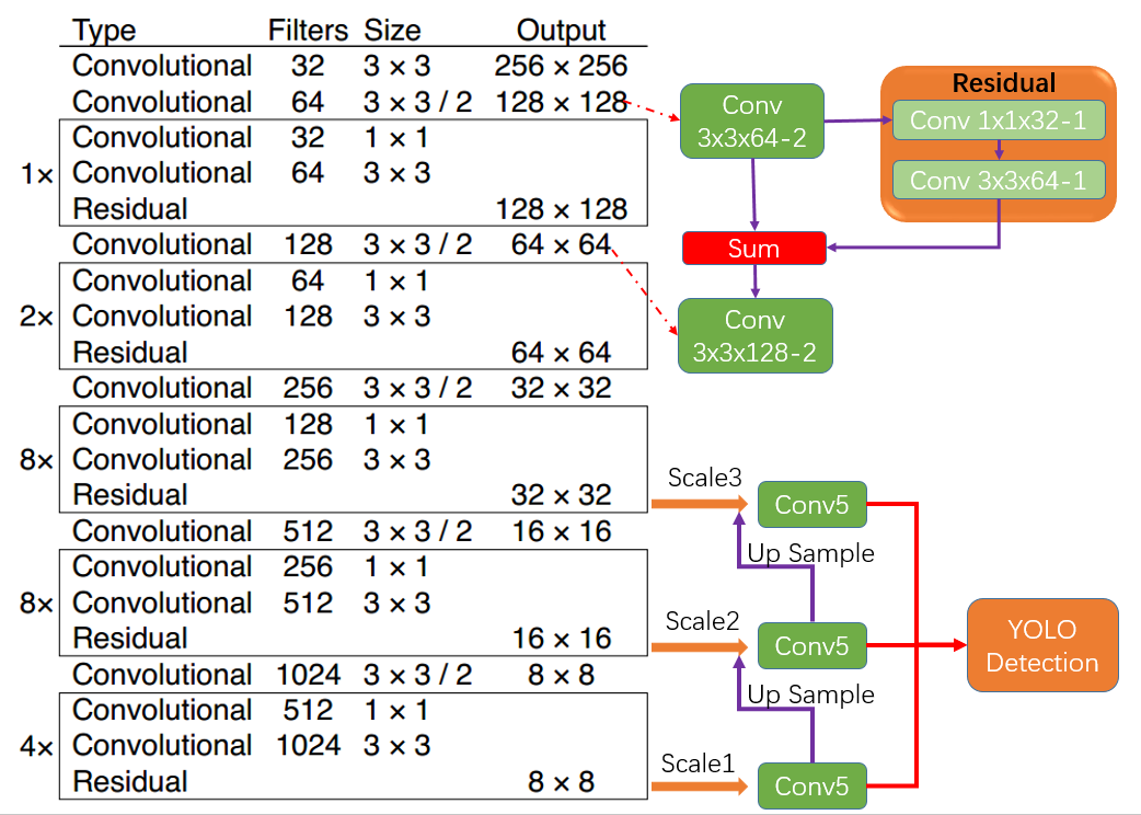 这就是Darknet-53网络的具体框架,接下来我们看下YOLO-V3算法是怎么嫁接上去的。