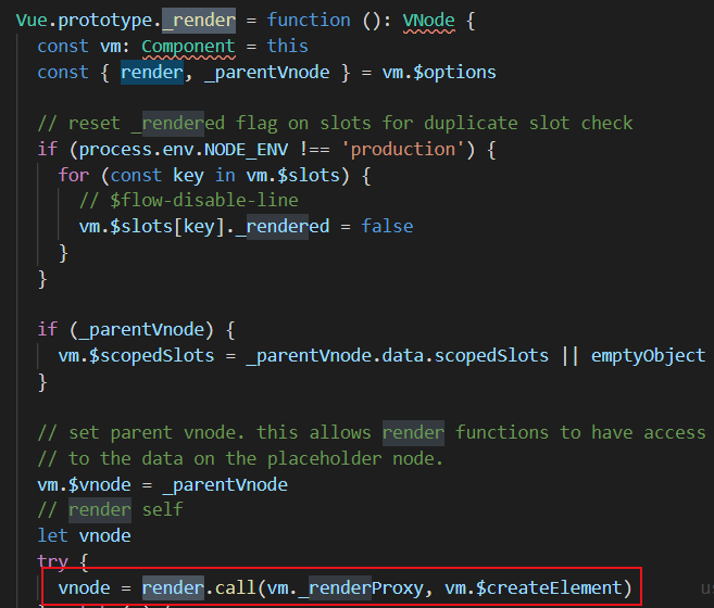 而在运行时,组件实例(也就是生命周期或者 methods 中访问的 this 对象)会通过option.render 去实现的。我们可以去 vue 的源码里验证一下我们的猜想。