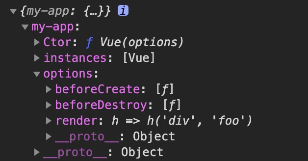 在 appOptions 中,混入生命周期方法 beforeCreate,在组件的这个生命周期中,把组件自身的示例 push 到 map 里对应 instances 数组中,并且记录自己的构造函数在 Ctor 字段上。 beforeCreate 执行完了以后的 map 对象长这样。