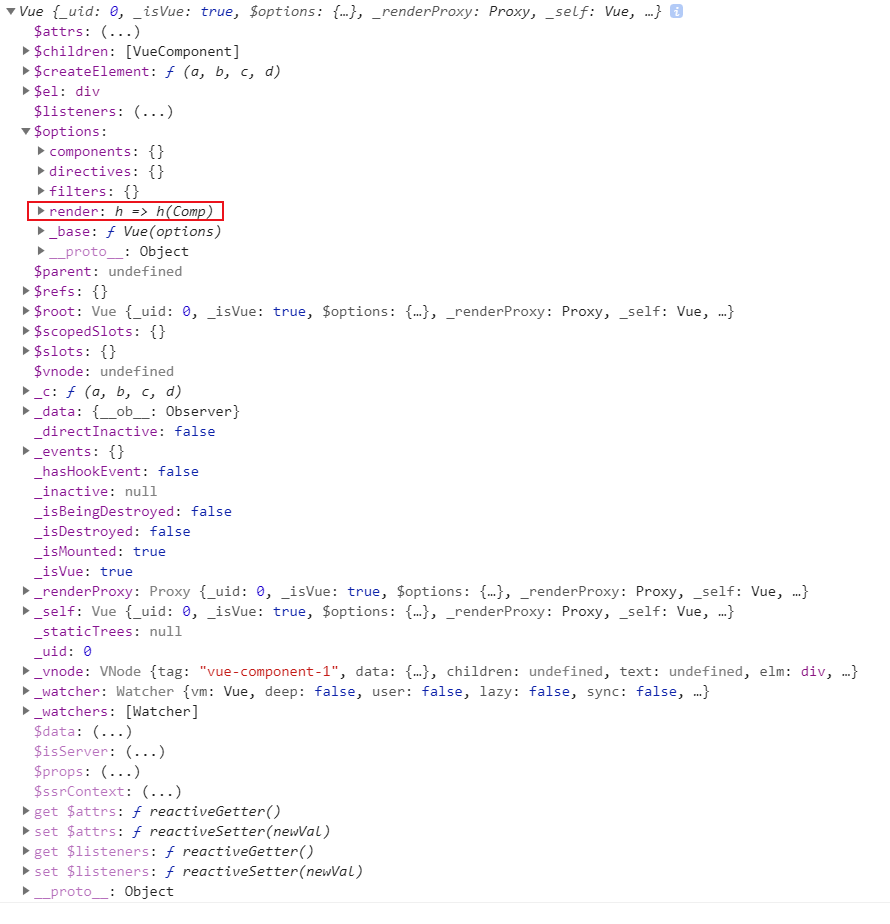 直接在放上控制台打印出来的截图,这个 context 是一个 vue 实例,注意这个 options 里的 render 函数,是不是非常眼熟,没错,这个 vue 实例其实就是我们的 prepare 函数中