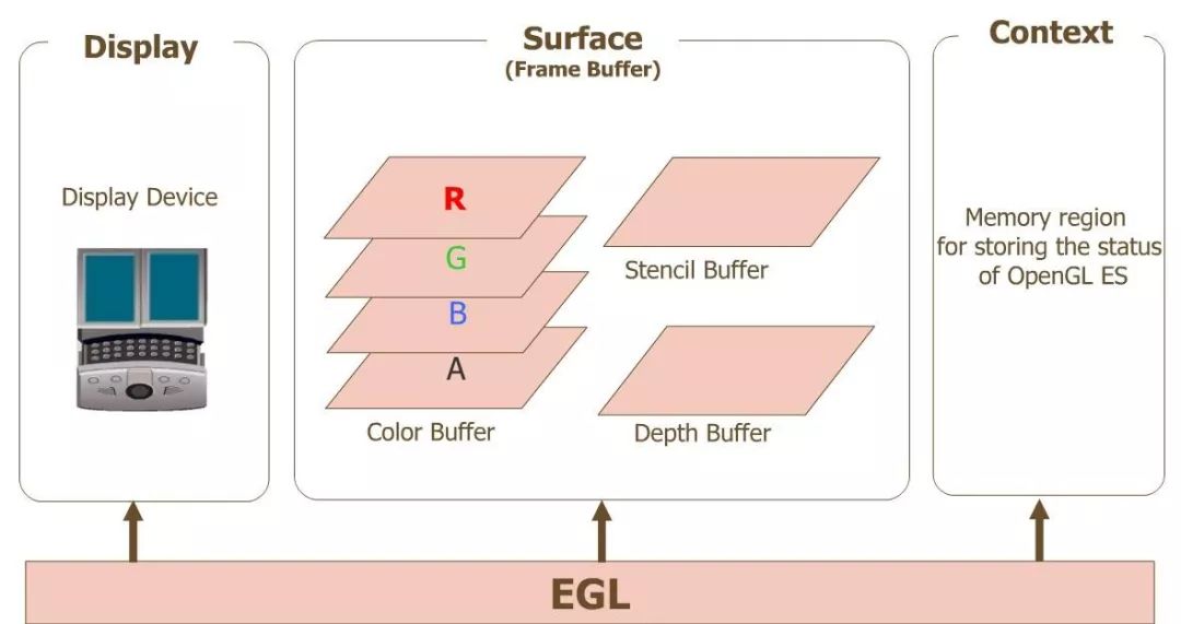 Surface(EGLSurface)是对用来存储图像的内存区域 FrameBuffer 的抽象,包括 Color Buffer(颜色缓冲区), Stencil Buffer(模板缓冲区) ,Depth Buffer(深度缓冲区);