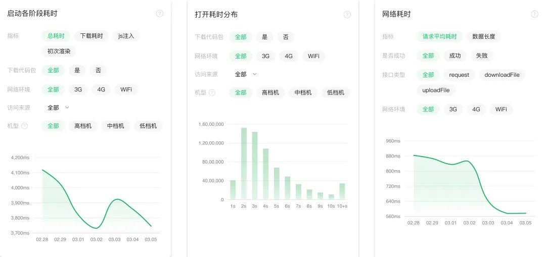 我们知道,体验评分工具是在本地运行小程序代码时进行分析,但性能数据往往需要在真实环境和大数据量下才更有说服力。恰巧,小程序管理平台 和 小程序助手 为开发者提供了大量的真实数据统计。其中,性能分析面板从 启动性能、运行性能 和 网络性能 这三个维度分析数据,开发者可以根据客户端系统、机型、网络环境和访问来源等条件做精细化分析,非常具有考量价值。